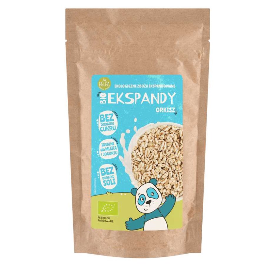 Bio EksPandy Orkisz HELPA to gotowe do spożycia “nadmuchane” zboża. Orkisz to gatunek pszenicy, ceniony za swoje właściwości. Zawiera węglowodany, białko i cenny błonnik. Dzięki Bio EksPandom możesz w szybki i prosty sposób dodać to wartościowe zboże do diety. Posyp nimi kaszkę, jogurt lub zupę.